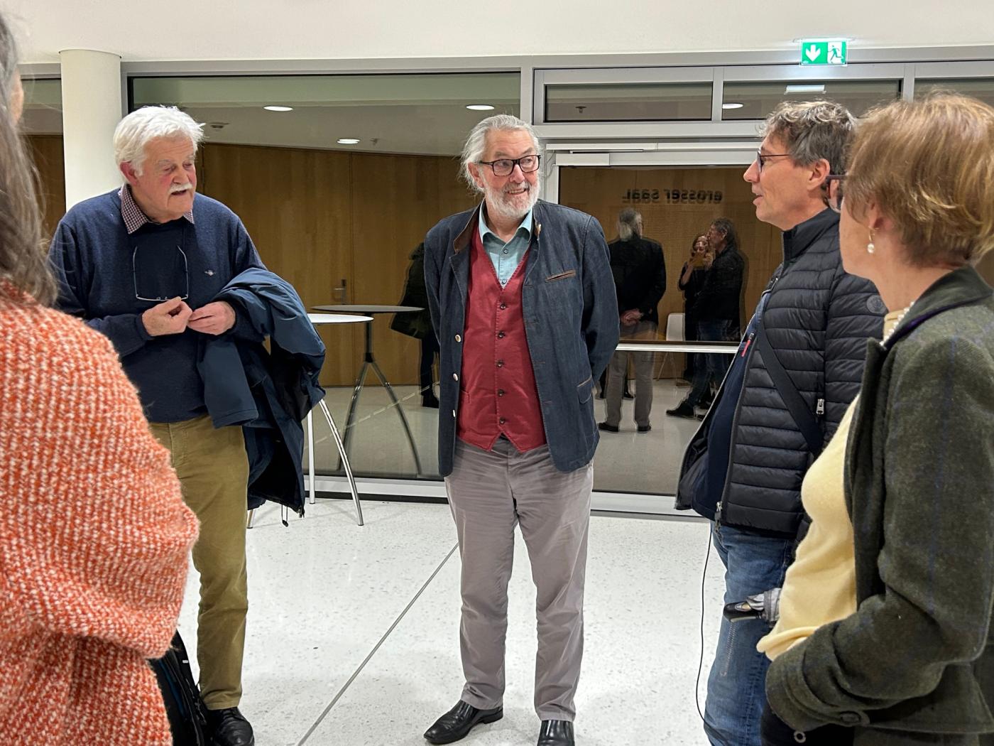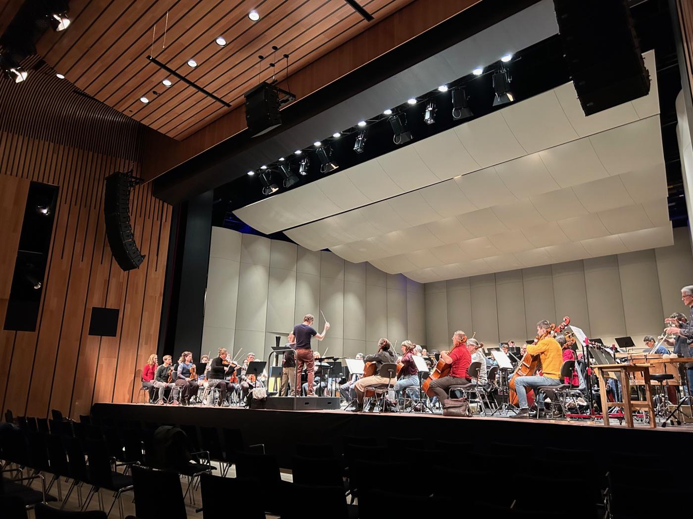Am Freitagabend vor den Konzerten versammelte sich ein kleines, interessiertes Grüppchen von Vereinsmitgliedern im Feldkircher Montforthaus, um der Probe zu Nikolaus Brass neuem Werk »Wie viel Heimat braucht der Mensch?« zu lauschen und dem SOV, Dirigent Jonathan Brandani und Sprecher David Kopp bei der Arbeit zuzusehen.