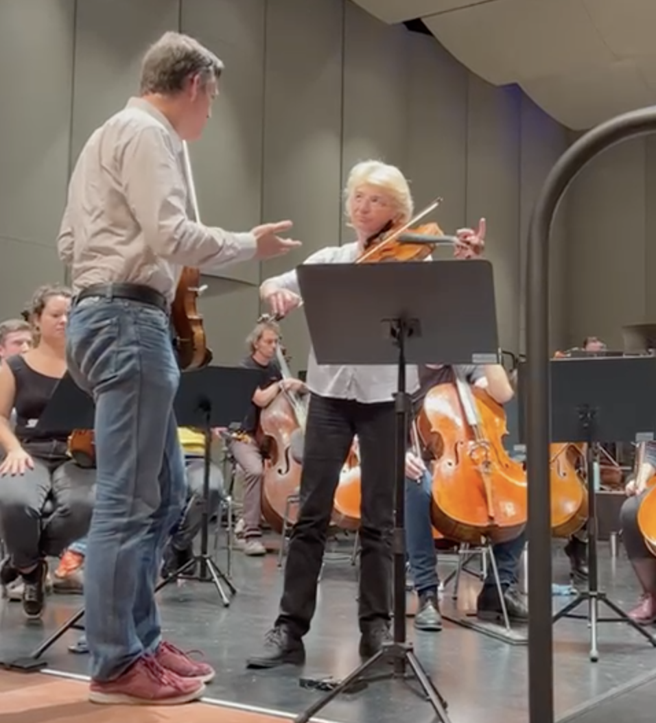 In der Probenpause durfte Antje Weithaas zu Bergs Violinkonzert befragt werden, was sie unglaublich fundiert, großartig und herzlich machte. – Vielen Dank dafür!